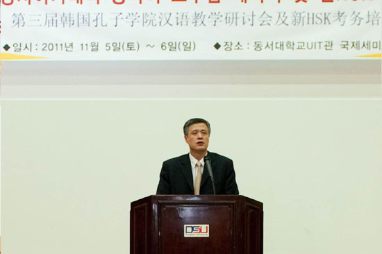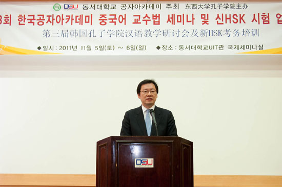 11月5日,由东西大学孔子学院主办的“第三届韩国孔子学院汉语教学研讨会暨新HSK考务培训”在美丽的港口城市釜山隆重开幕。驻韩使馆教育处安玉祥参赞、东西大学校长张济国先生、韩国孔子学院联合会会长金钟贤教授等出席了开幕式,韩国15家孔子学院的韩方院长、中方院长、公派汉语教师、志愿者教师等160余人参加了大会,大会由东西大学孔子学院韩方院长金彦河教授主持。