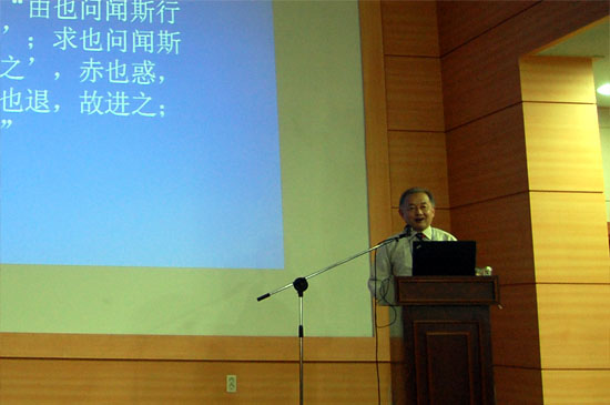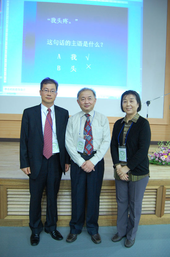 开幕式结束后,韩国外国语大学孔子学院韩方院长孟柱亿教授和北京语言大学谢小庆教授分别以《关于韩国孔子学院汉语教学的课题》和《为什么要开发新HSK考试》为题目做了精彩演讲。孟柱亿教授从韩国孔子学院的教育对象、教师及教师培训、教材、教学法和教学模式、课程设置、加强各孔院之间的交流等几大方面对韩国孔子学院的现况和问题做了精辟的分析和高度概括,提出了具体的意见和建议。谢小庆教授结合老HSK考试存在的问题和新HSK的特点,阐述了开发新HSK的必要性。谢老师采取理论结合实际的讲解方式,声情并茂、趣味盎然,他充满激情而风趣的讲解使会场里不时爆发出阵阵掌声和笑声,使所有的听者都感到受益匪浅。